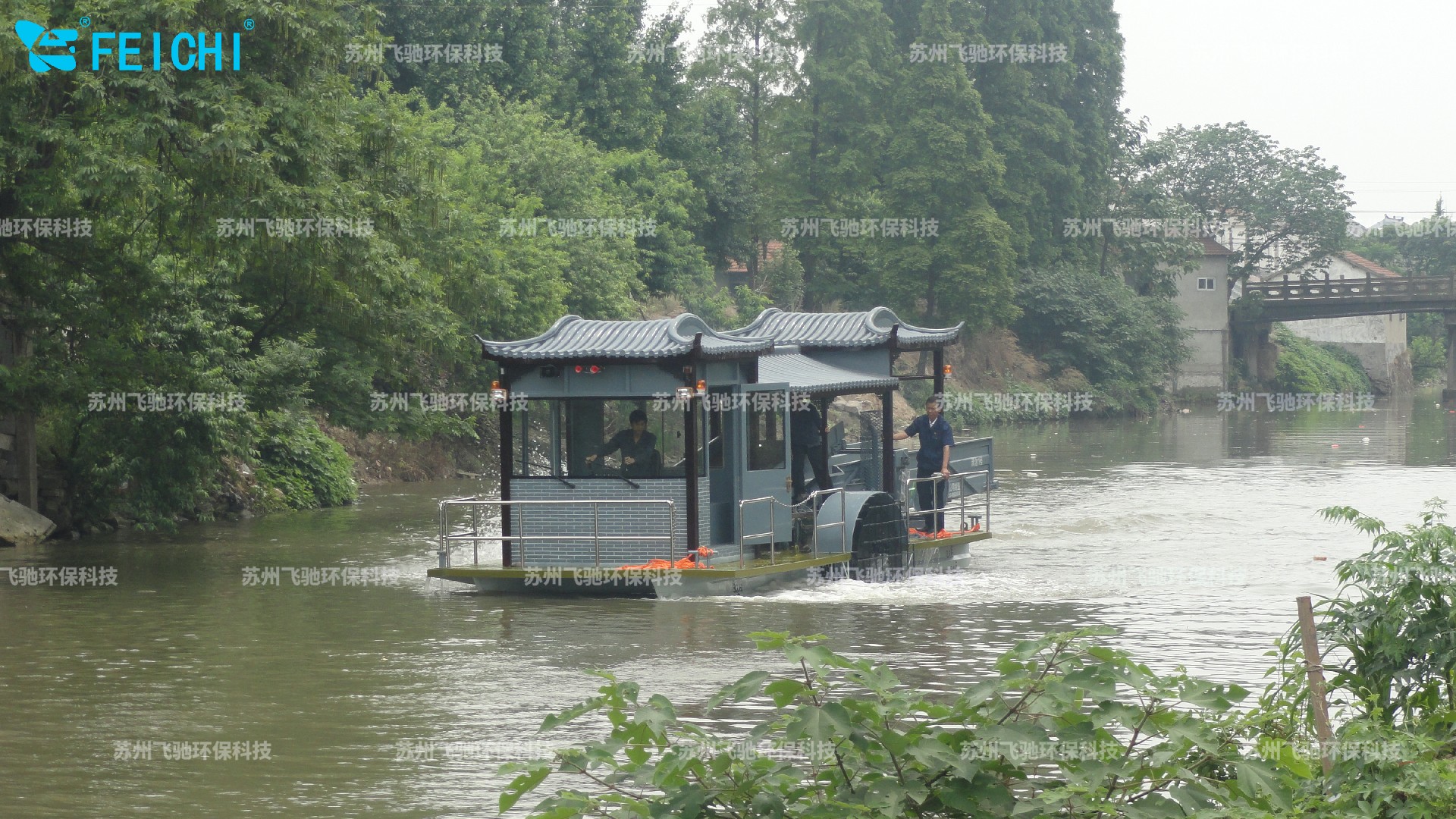 +全自動(dòng)水面清潔船的制作外形和收集輸送裝置配置合理,結(jié)構(gòu)緊湊,頂部采用仿古式,外觀設(shè)計(jì)與打撈作業(yè)區(qū)的風(fēng)景相協(xié)調(diào)。